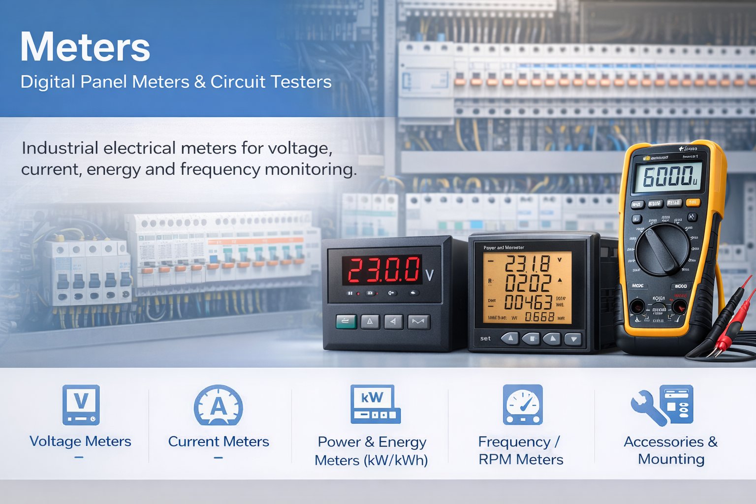 Meters are electrical measuring instruments used to monitor and verify key parameters such as voltage, current, resistance, frequency, power, and energy in control panels and field troubleshooting.