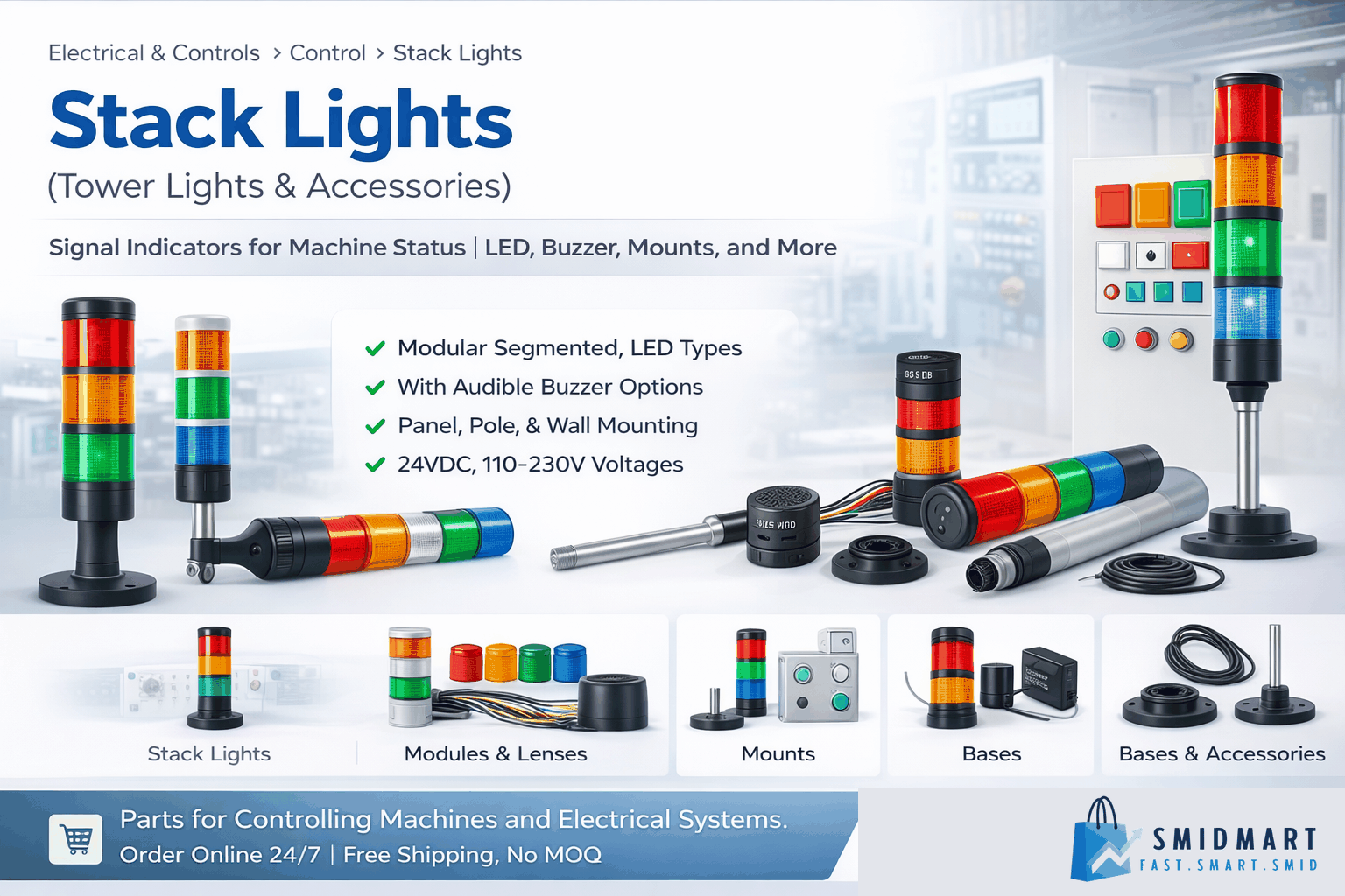 Stack Lights (Tower Lights) are industrial signal indicators used on machines, control panels, and production lines to show real-time machine status (Run / Stop / Alarm / Call / Maintenance). They improve visibility on the shopfloor, reduce response